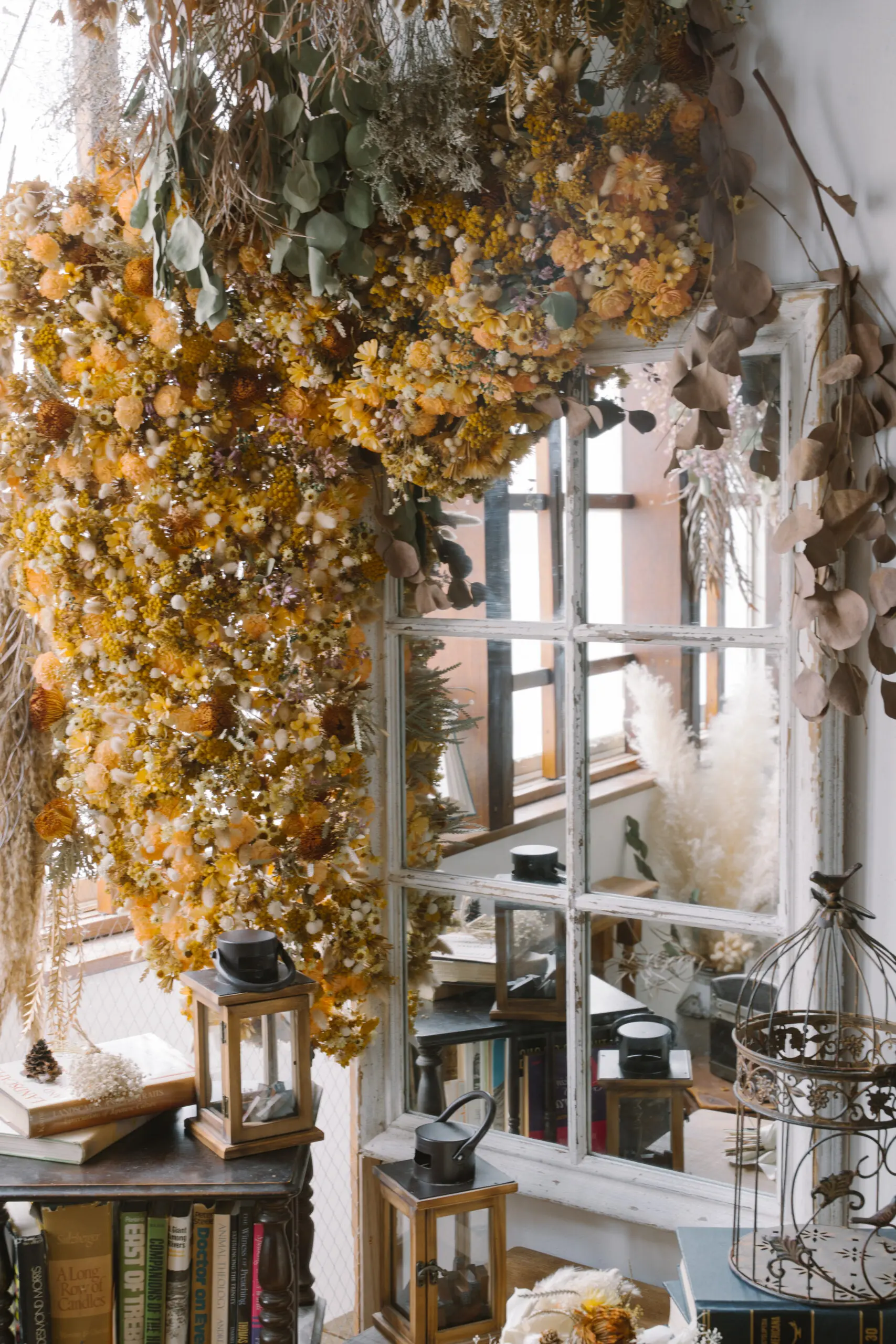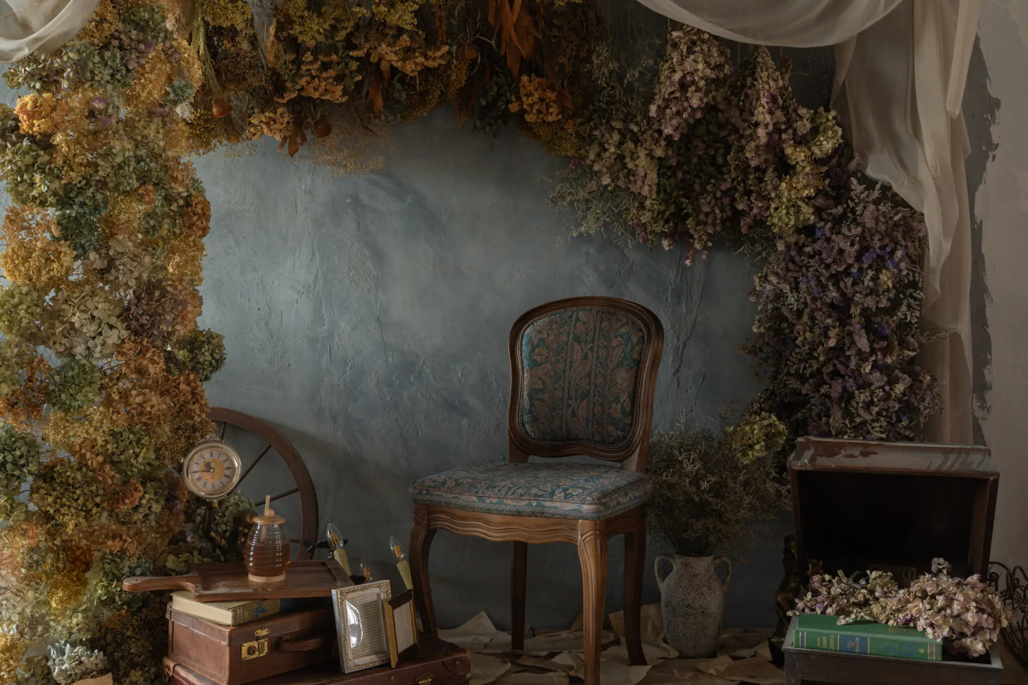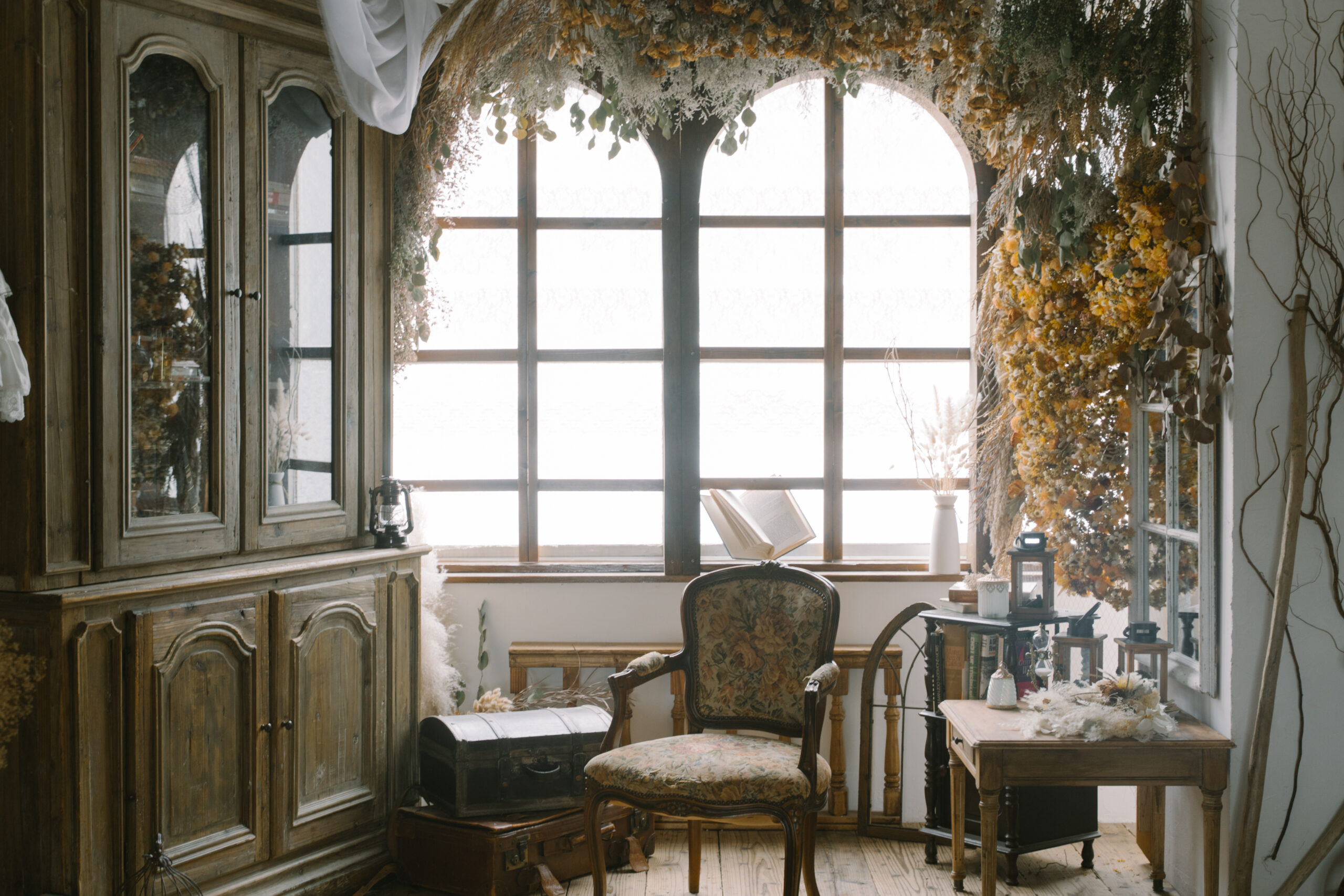 西洋より受け継がれたアンティーク家具を用い、心地良い太陽光とドライフラワーがスタジオを彩ります。